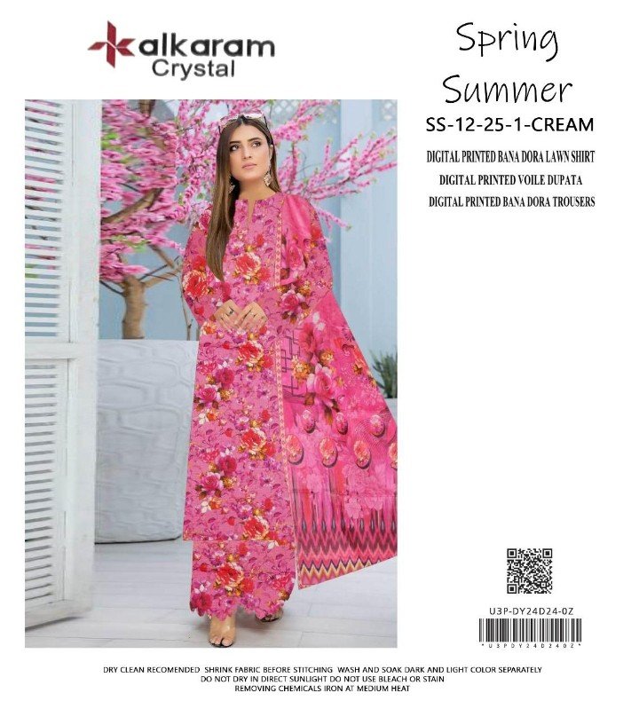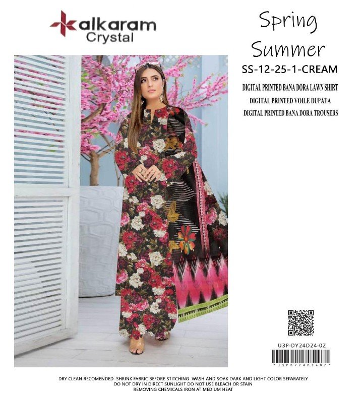 Bana Doria Lawn All Over Print 3 Piece suit fine quality doria lawn fabric se tayar kiya gaya hai. Iska full printed pattern outfit ko vibrant aur graceful appearance deta hai jo summer season ke liye ideal hai.