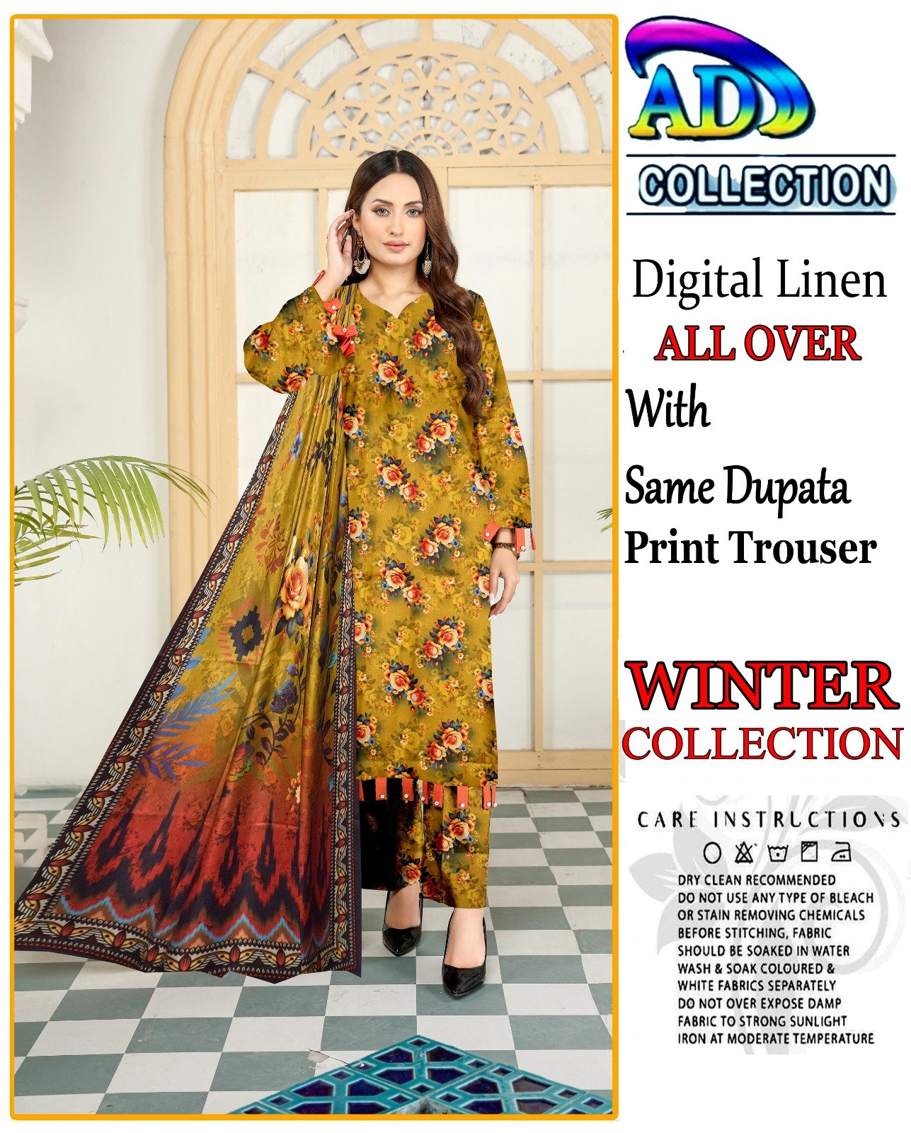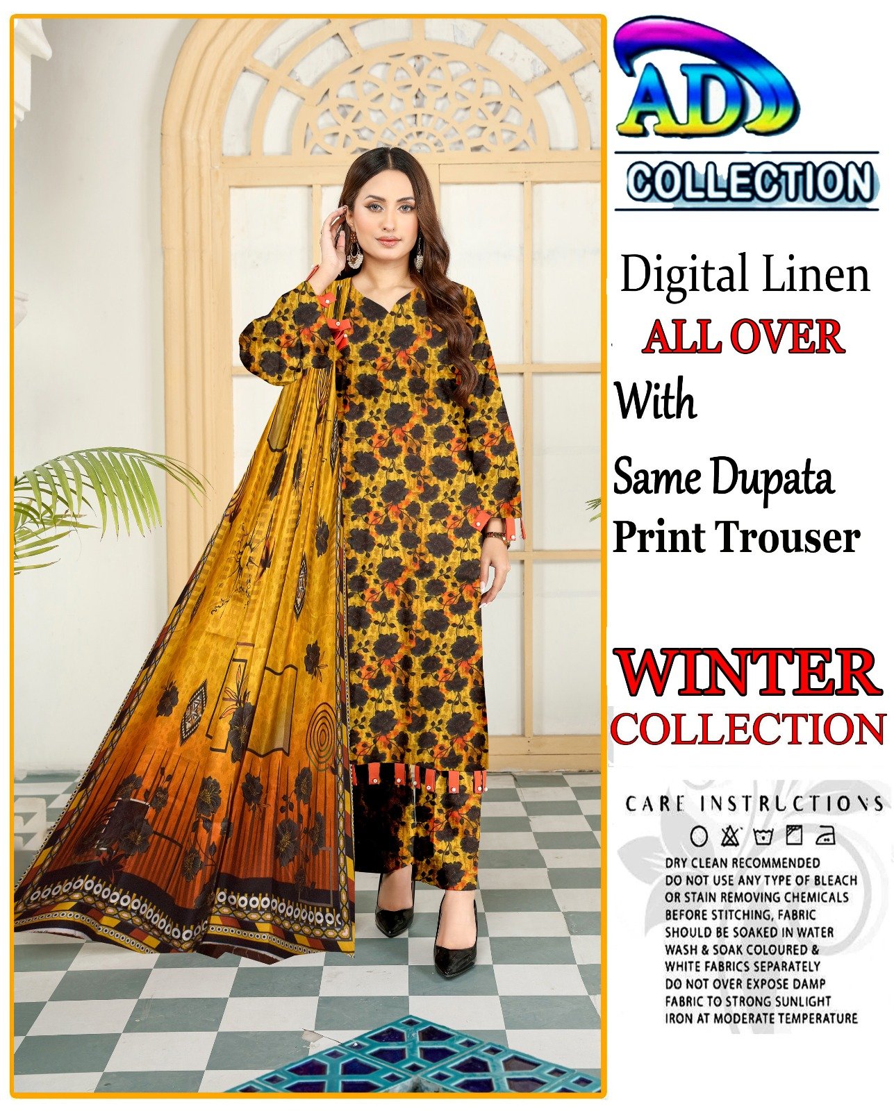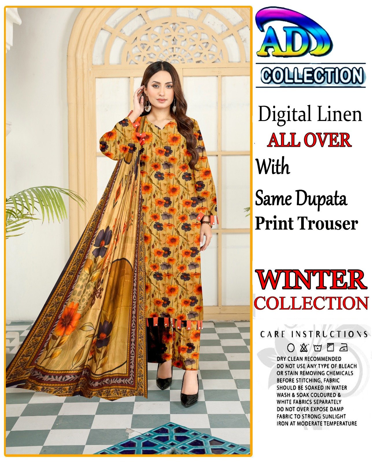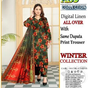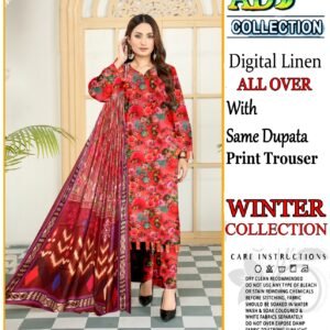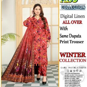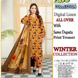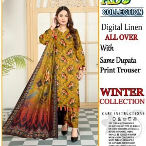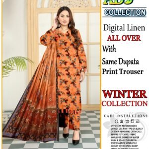 This elegant 3-piece digital print linen set is designed to add sophistication to your winter attire. The soft linen fabric ensures comfort during the colder months, while the intricate head sequence embroidery adds a touch of elegance. The set includes a 7.5-meter fabric for a perfect fit, complemented by a dyed plain trouser for a complete look.