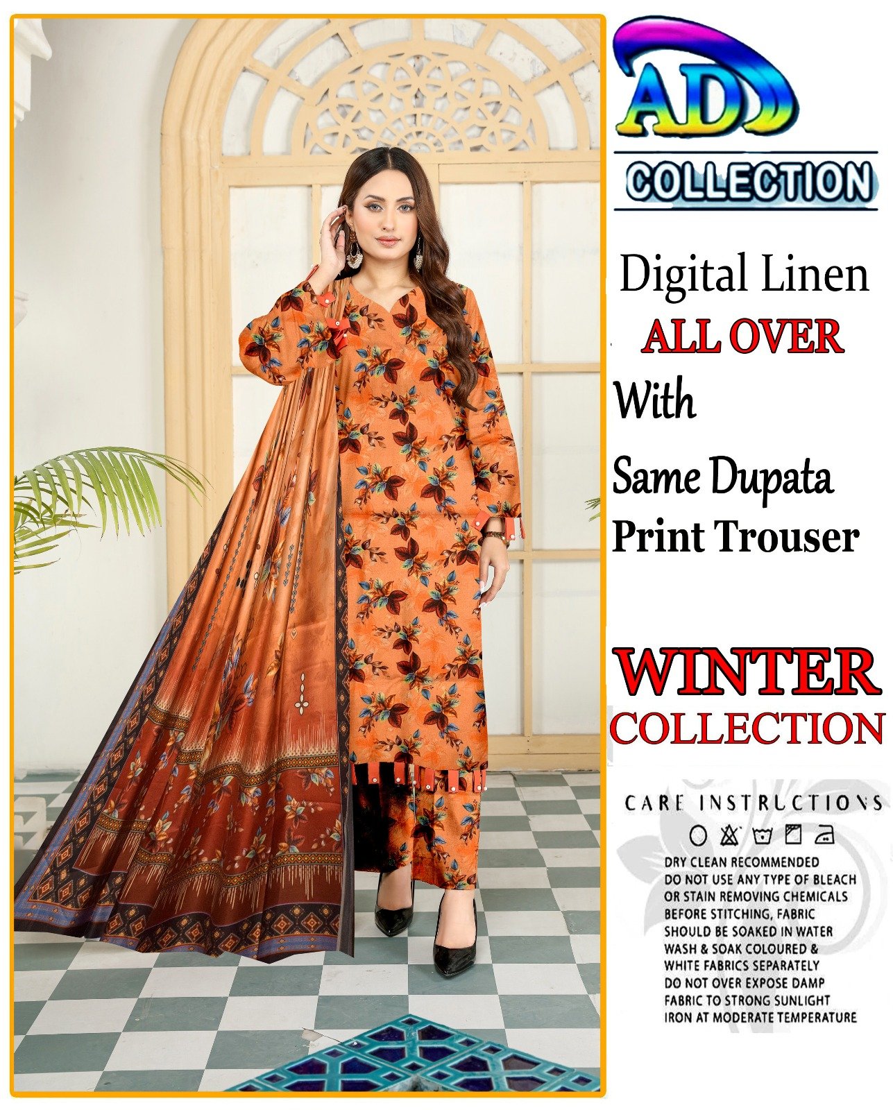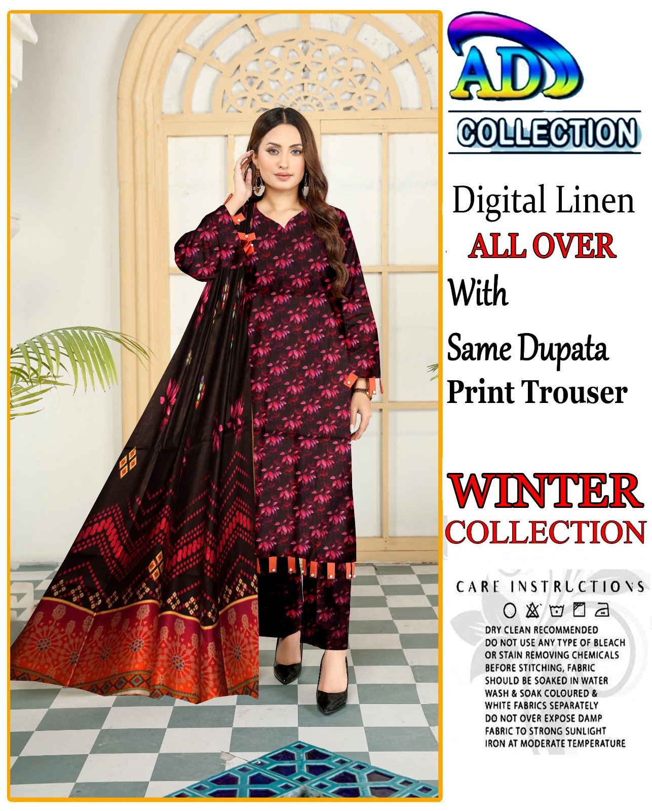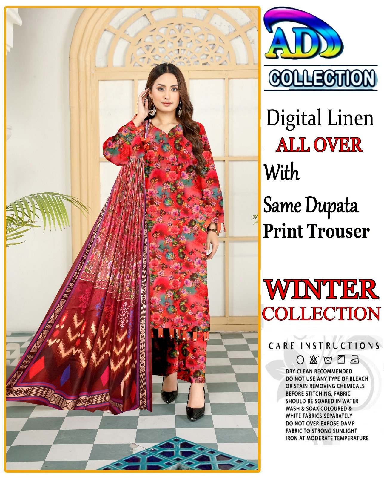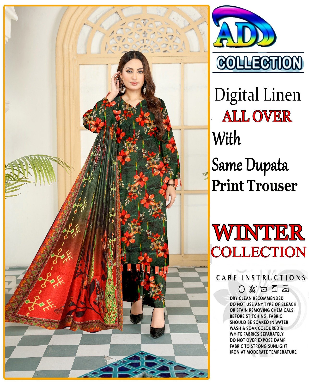 This elegant 3-piece digital print linen set is designed to add sophistication to your winter attire. The soft linen fabric ensures comfort during the colder months, while the intricate head sequence embroidery adds a touch of elegance. The set includes a 7.5-meter fabric for a perfect fit, complemented by a dyed plain trouser for a complete look.