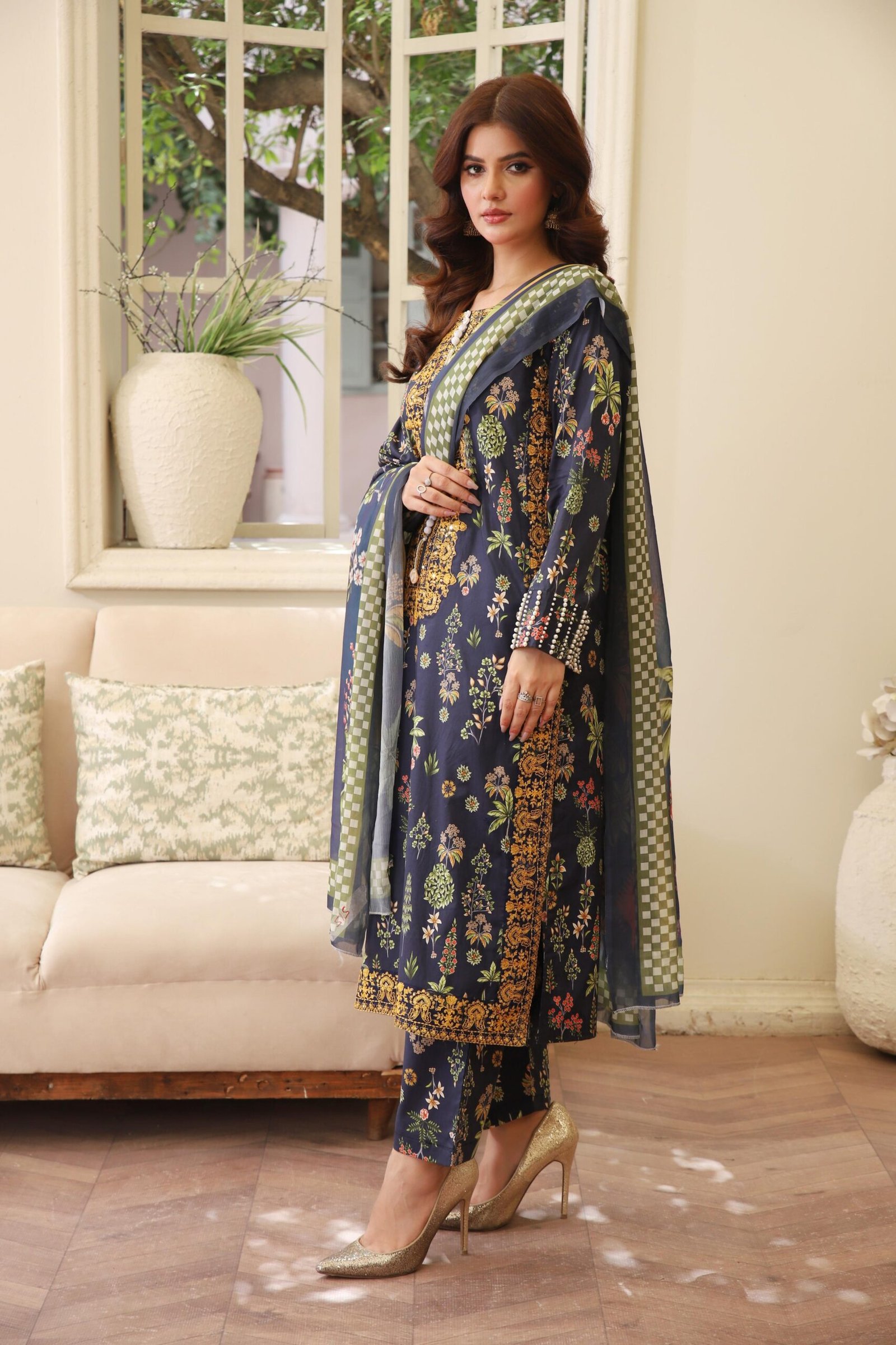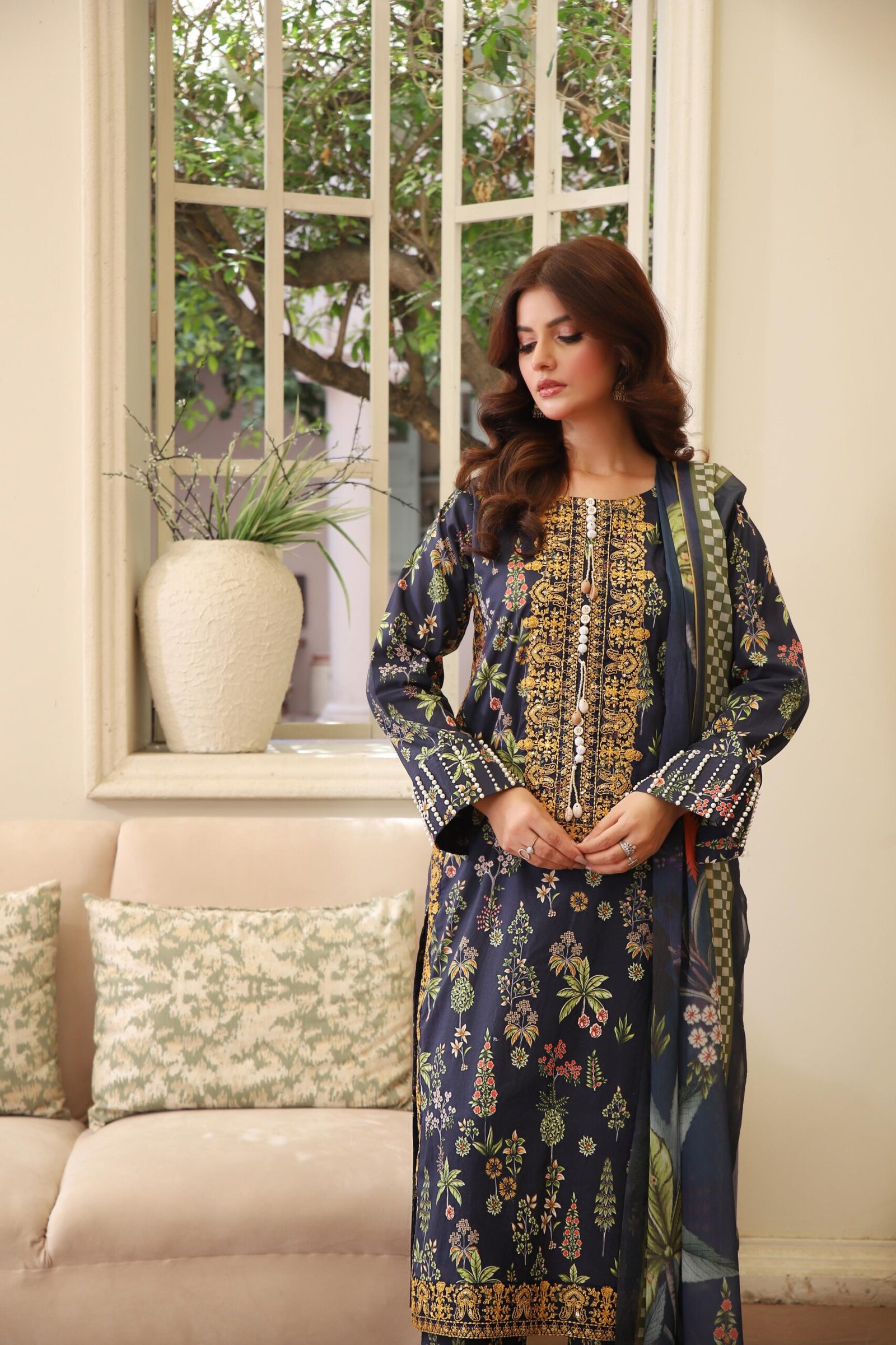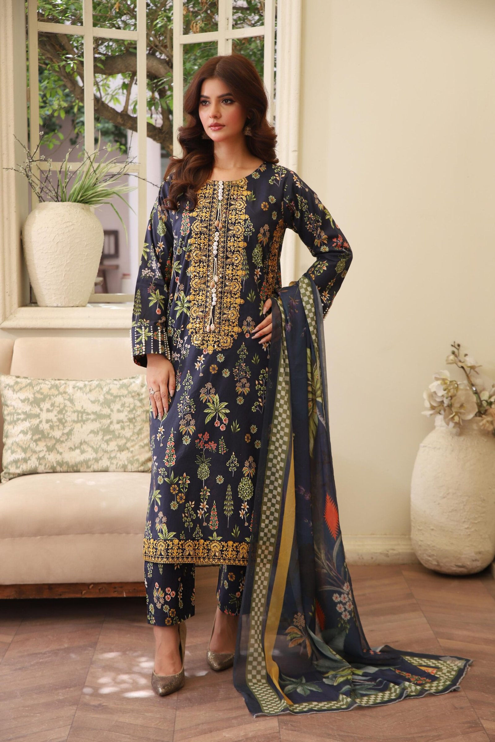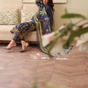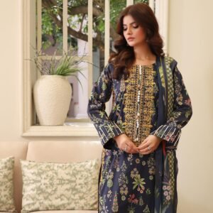 Pakistan mein embroidered lawn suits hamesha demand mein rehte hain, khas tor par blue tones jo timeless aur versatile hote hain. Is outfit ka neat finishing aur balanced stitching isay daily wear se le kar semi‑formal occasions tak adaptable banata hai.